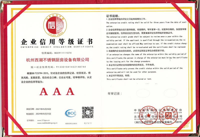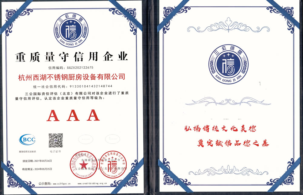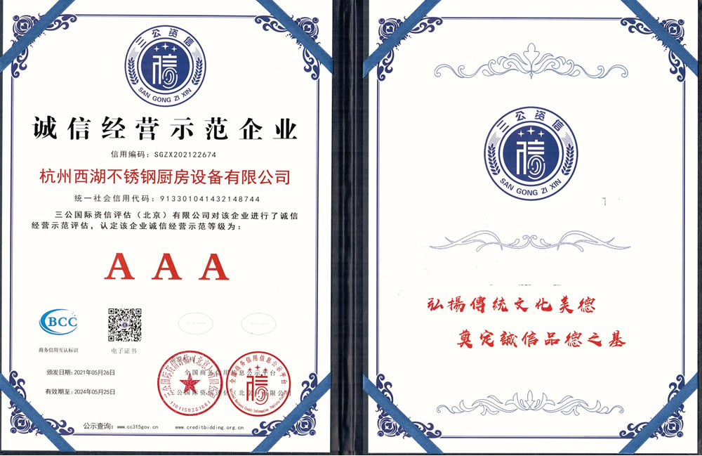 杭州西湖不銹鋼廚房設備有限公司成立20年以來,通過一系列創造性的工作,凝聚企業力量,發揮自身優勢,助推企業發展和品牌建設,取得了一些榮譽,這是廣大西湖廚房設備員工共同努力和各位新老客戶共同支持的結果,我們將再接再厲創造更多的輝煌!